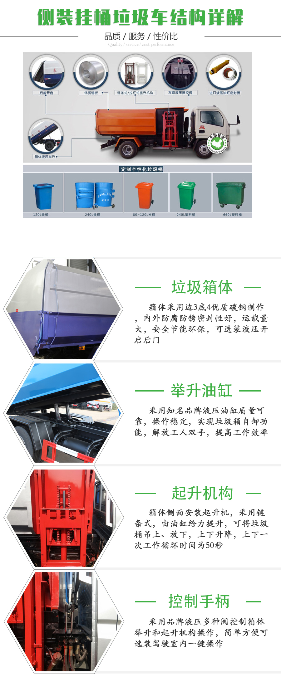 側裝對接式垃圾車的裝載容積是12立方,特點是一個車能配幾十個垃圾桶,能實現(xiàn)一臺車與多個垃圾桶聯(lián)合作業(yè),循環(huán)運輸,充分提高了車輛的運輸能力,特別適用于短途運輸,如環(huán)衛(wèi)部門對城鎮(zhèn)垃圾的清理、運輸?shù)?。同時,掛桶垃圾車還可以加裝其它功能,形成其它多功能掛桶垃圾車,如:掛桶壓縮式垃圾車、掛桶式泔水垃圾車、掛桶式對接垃圾車等。