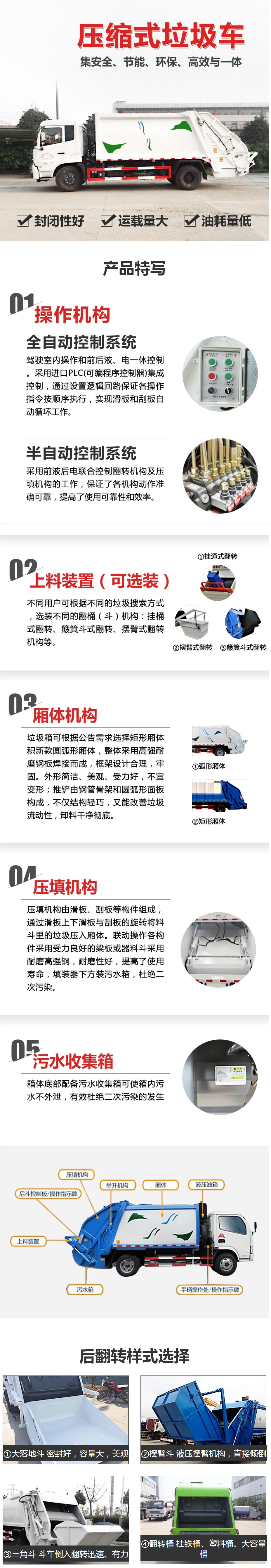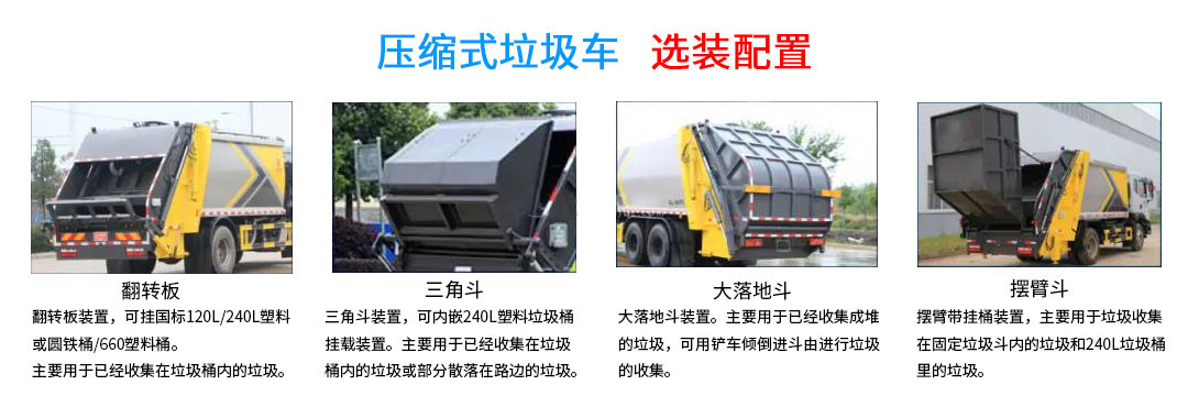 采用Q345錳鋼鋼板,新式弧形箱體,雙聯(lián)泵、背壓閥(壓實(shí)閥)、油路過(guò)濾器,無(wú)線遙控,倒車影像,可選掛桶翻轉(zhuǎn)機(jī)構(gòu),氣控密封蓋、三角斗、全密封大落地斗、擺臂裝置等。