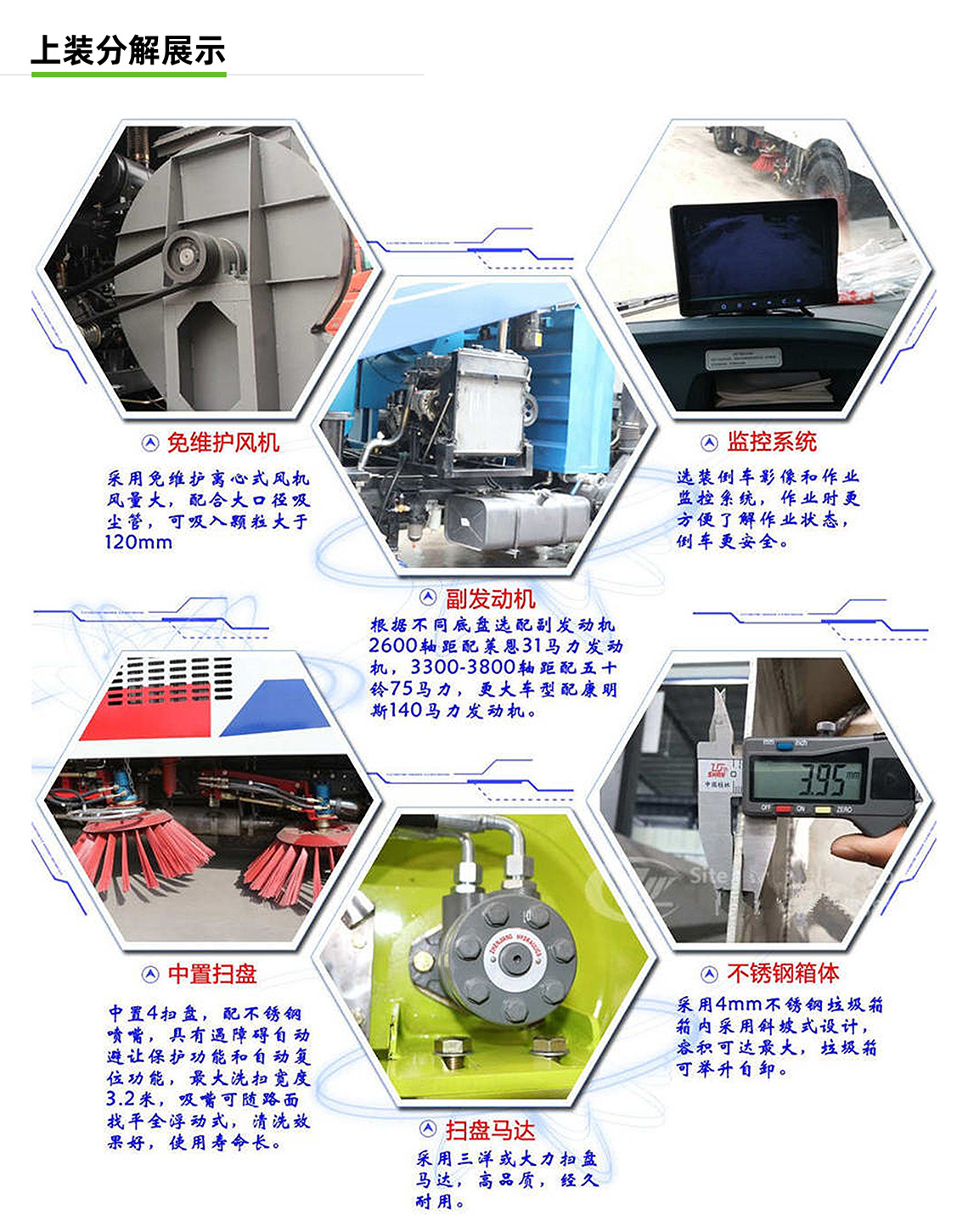 帶掃盤4把,江鈴副發(fā)動機;大力馬達(dá);施耐德控件開關(guān);臺灣電磁閥組;免維護(hù)自分離式離合器;免維護(hù)風(fēng)機;不銹鋼水箱;不銹鋼垃圾箱;尾部LED箭頭燈;手動泵應(yīng)急系統(tǒng);刷臂轉(zhuǎn)動機構(gòu)使用高新耐磨工程隔套,免打黃油;精密冷彎無縫液壓油管。