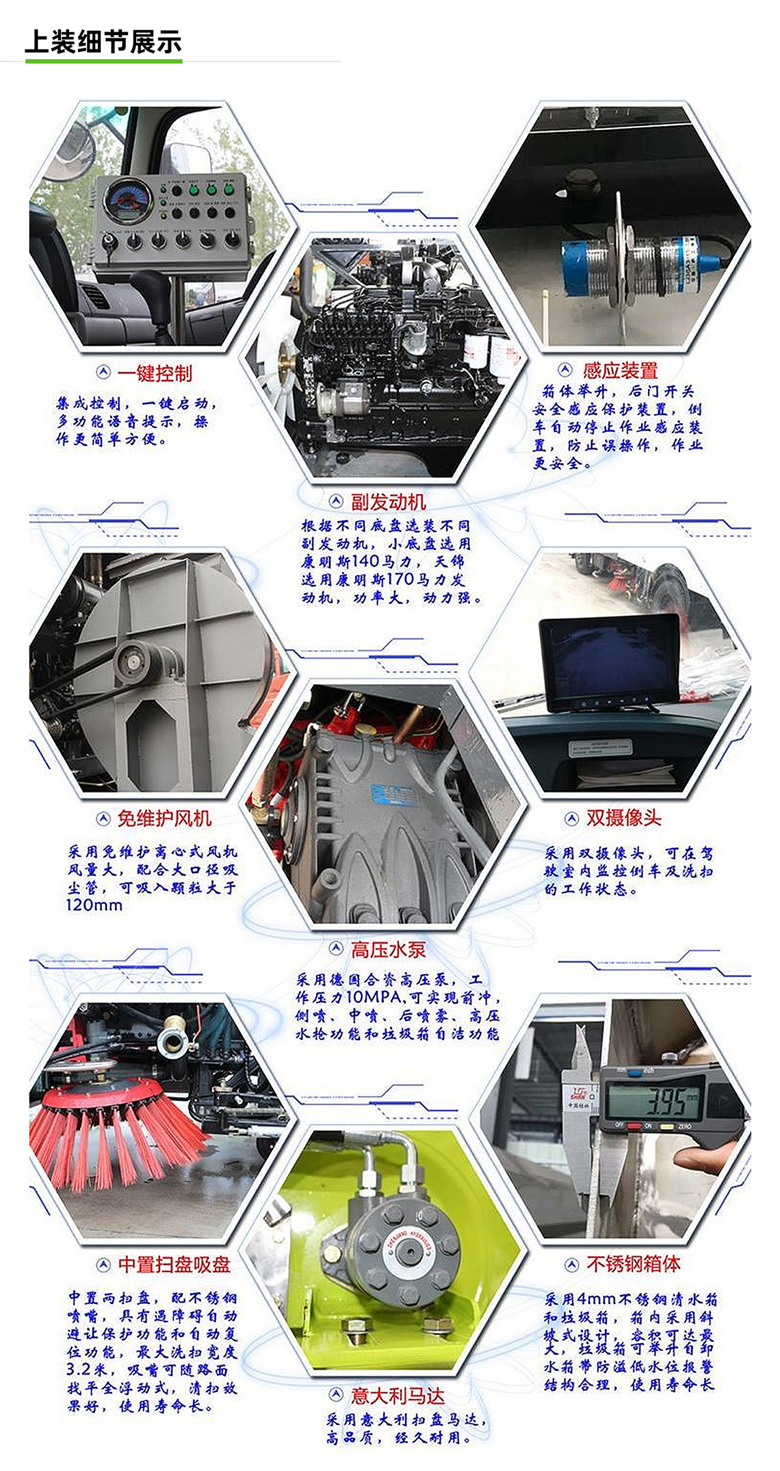 2:采用"中置兩立掃+中置寬吸嘴(內(nèi)置高壓水噴桿)+左右高壓側(cè)噴桿"的結(jié)構(gòu)。
